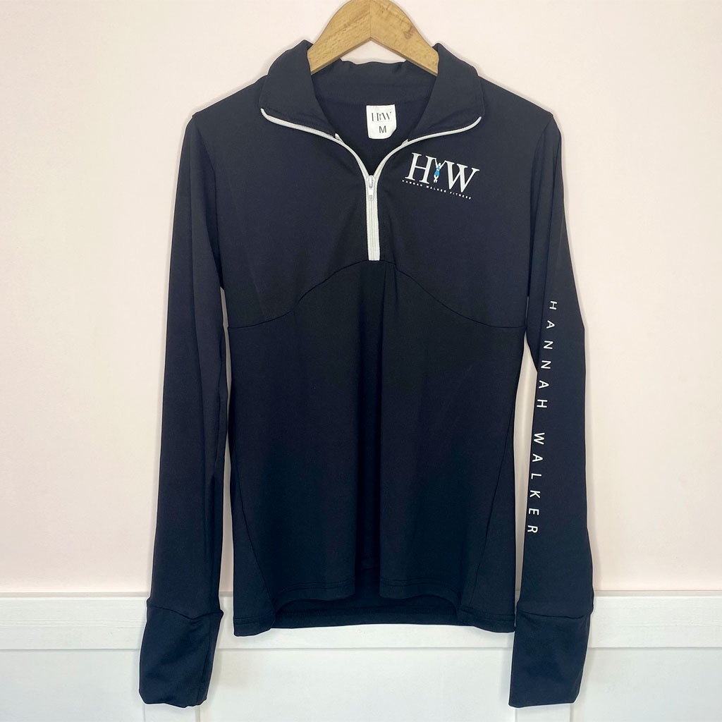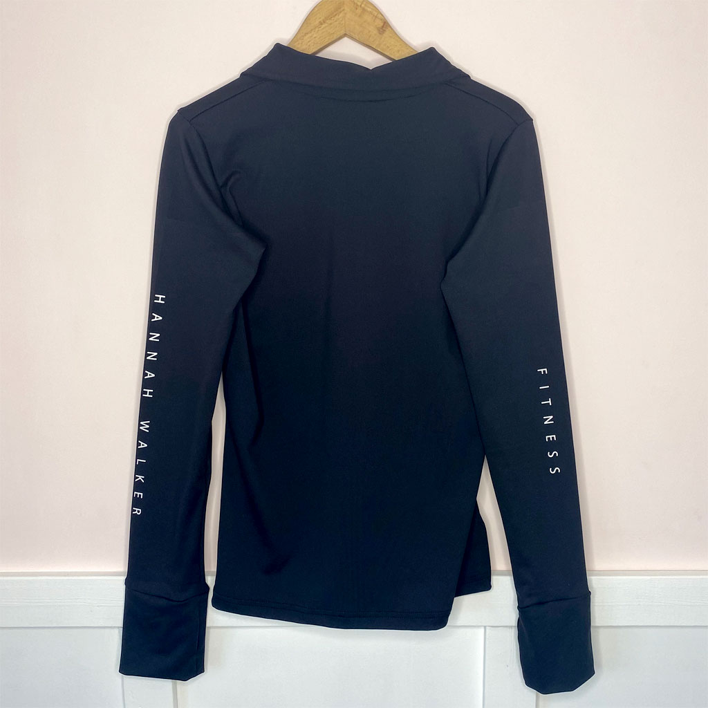 Description: Slim fit HannahWalkerFitness Sweat Top, features sleeves that can be converted into mittens in cold conditions to help keep your hands warm. Complete with a 1/4 zippered design that lets you adjust the airflow for your comfort.