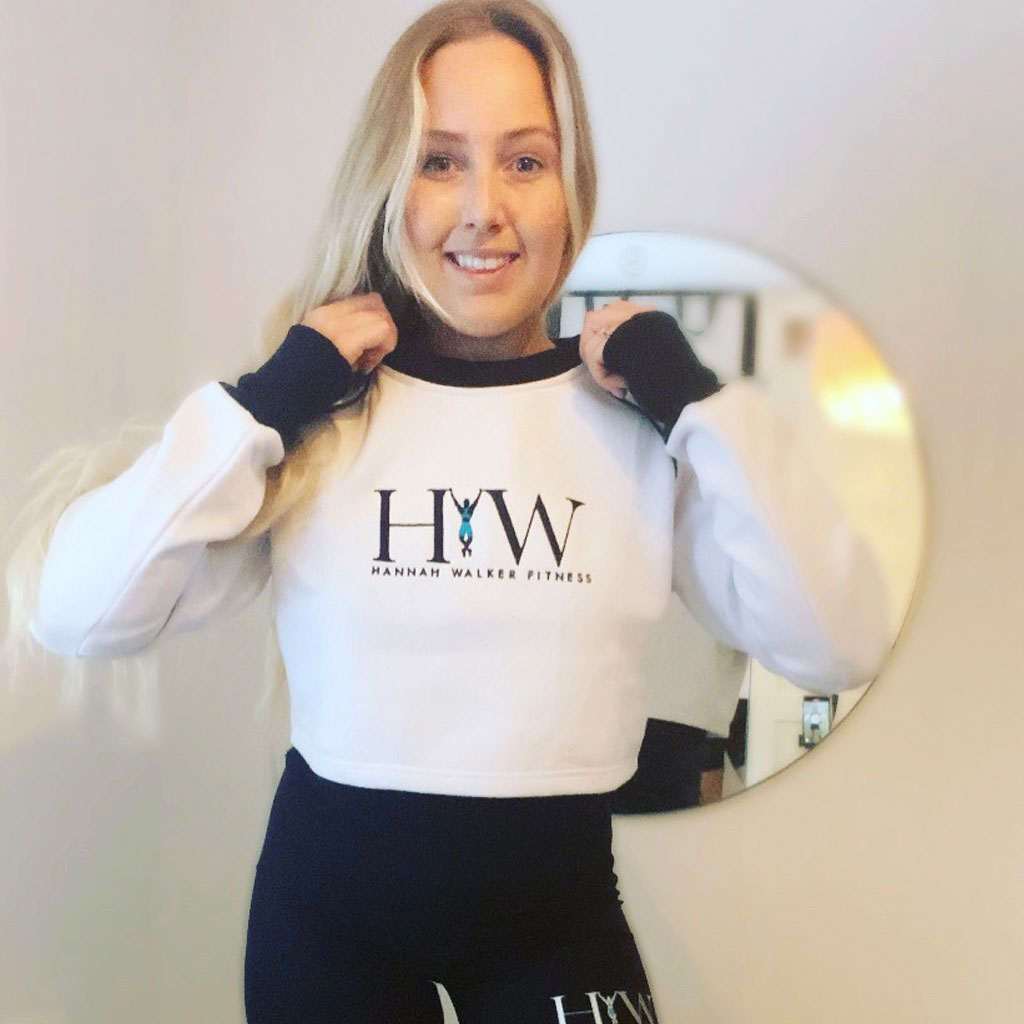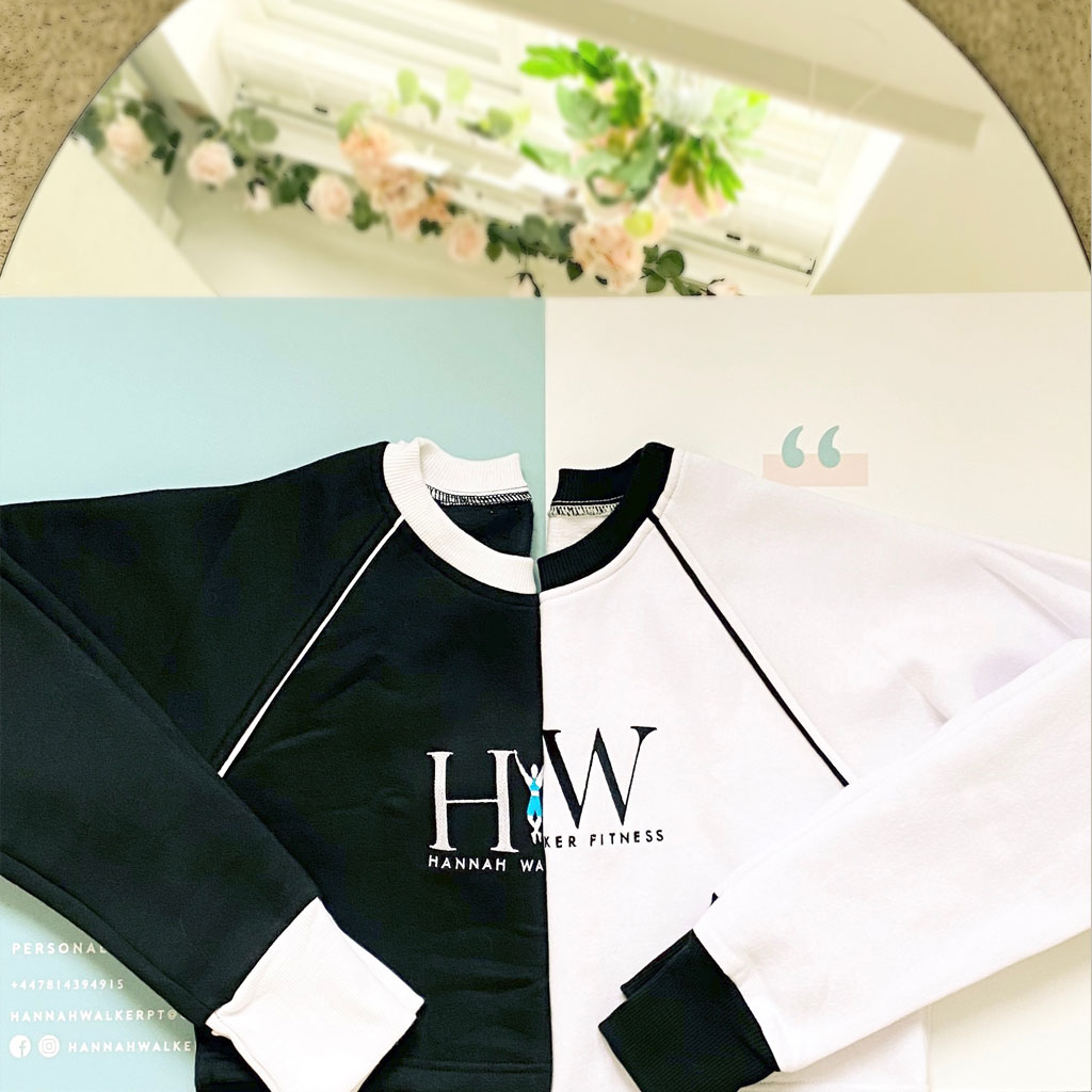 Description: Cropped jumper with contrasting neck and cuff. Large embroidered logo on the front with Hannahwalkerfitness on the back.