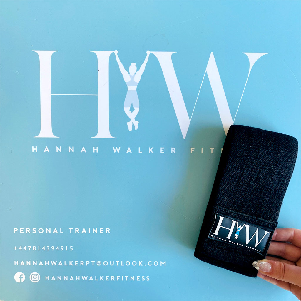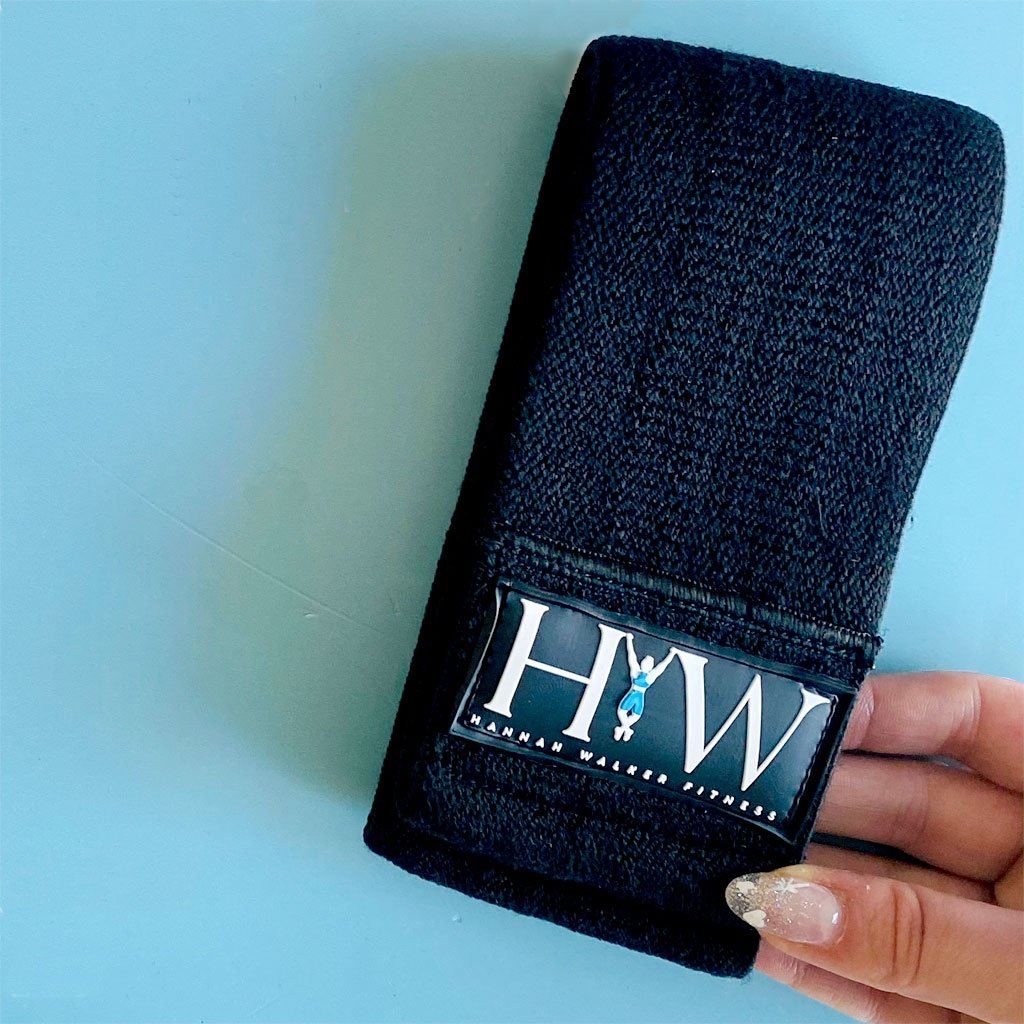 Description: Hannah Walker Resistance Workout Band, with Hannahwalkerfitness Printed on the resistance band.