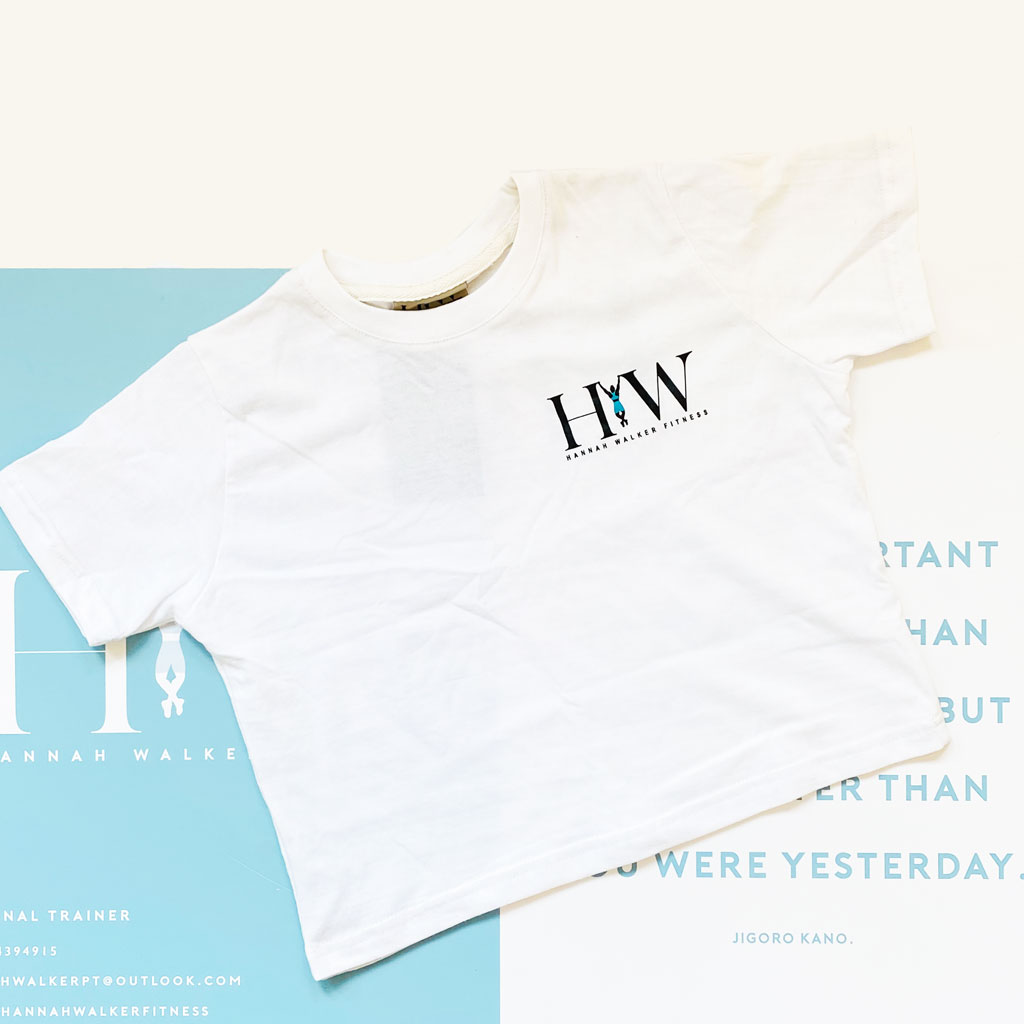 Description: White T-Shirt (Cropped or Full Length Unisex) with logo on front and back.